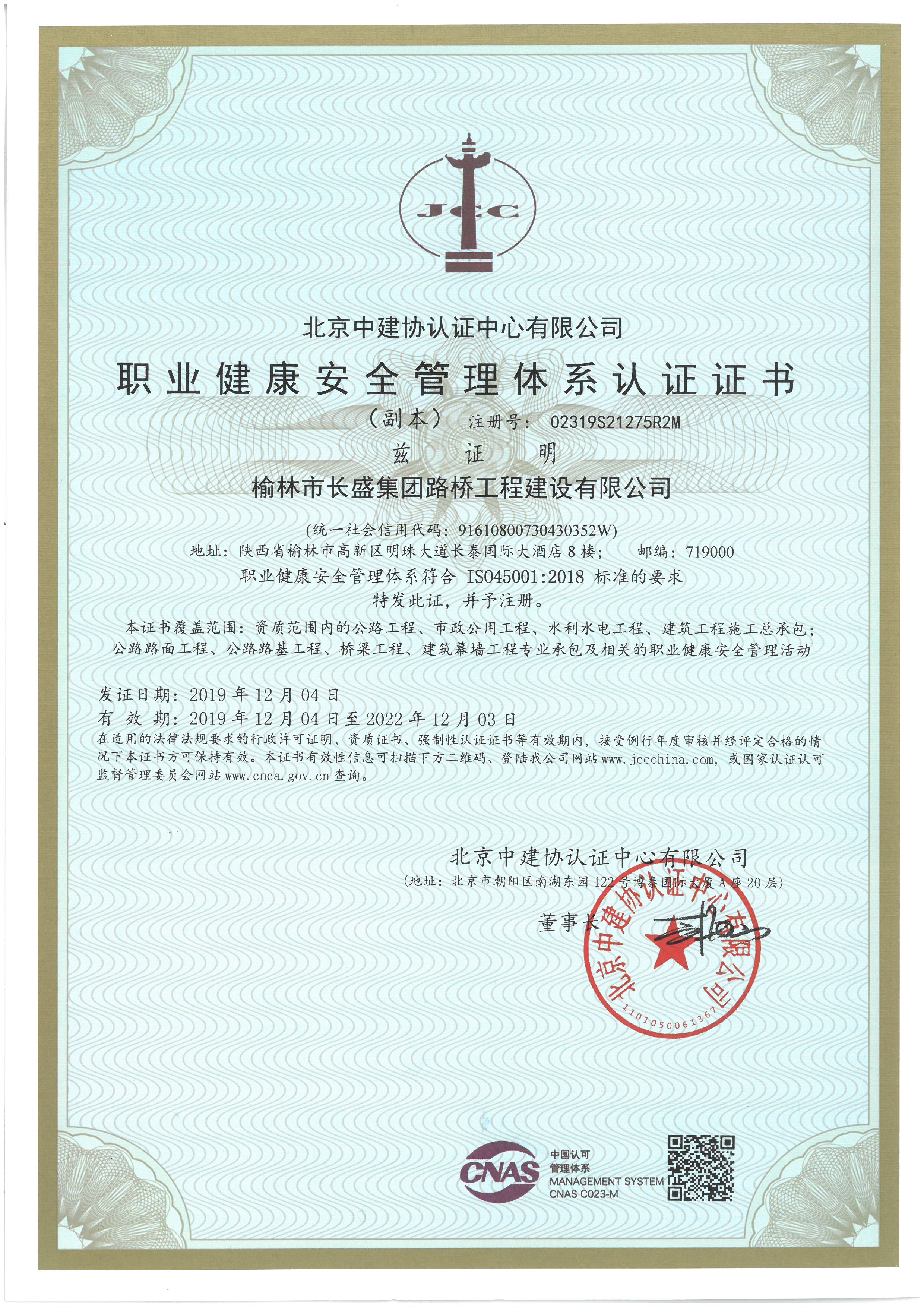 職業(yè)健康安全管理體系認證證書