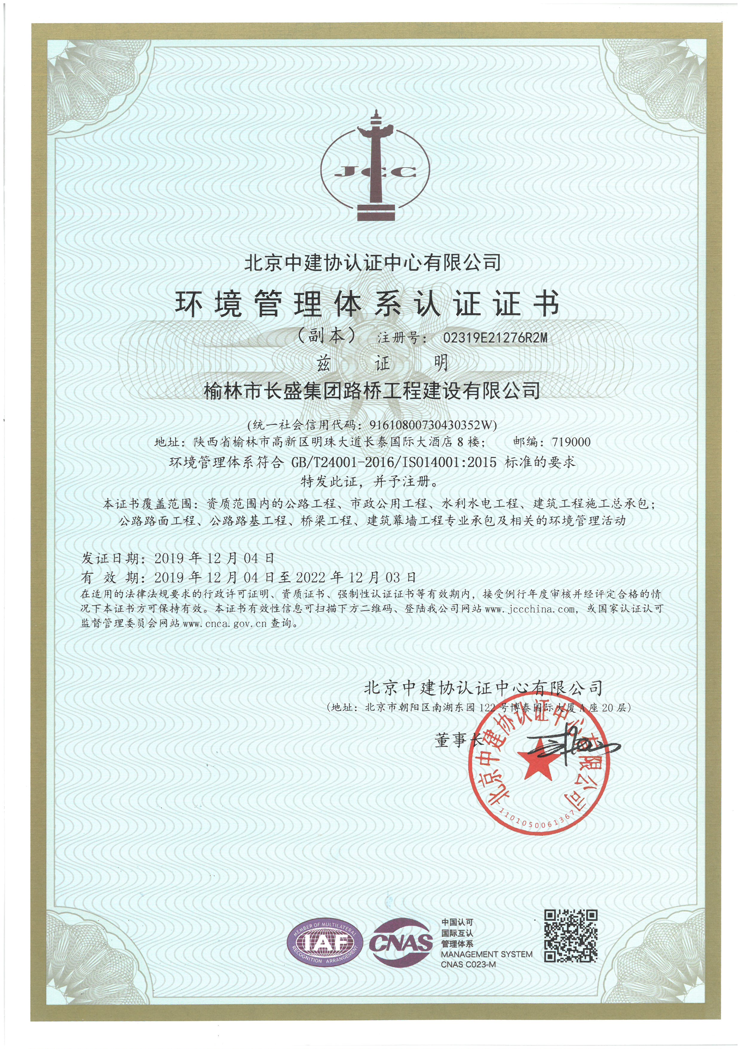 環(huán)境管理體系認證證書