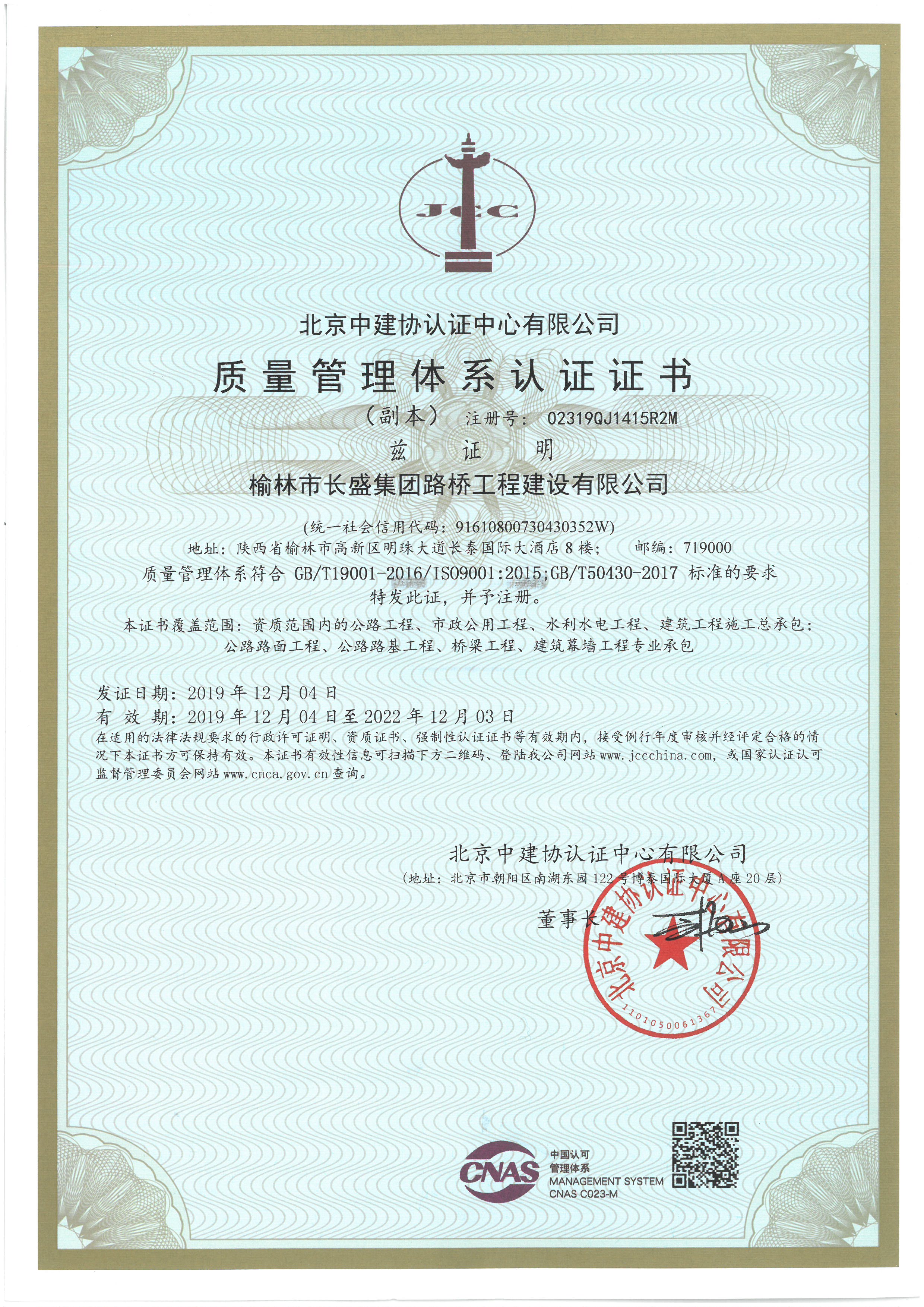質(zhì)量管理體系認證證書