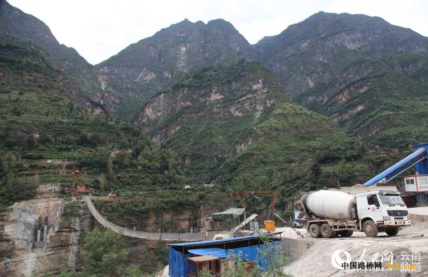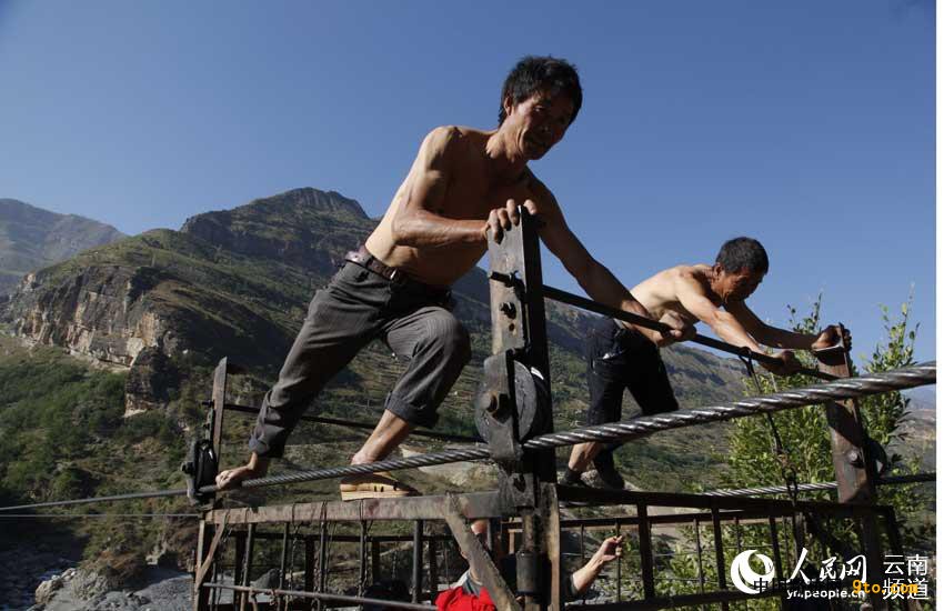 運(yùn)輸工程材料的簡(jiǎn)易吊橋已經(jīng)修通,村民可以從橋上通過。圖/人民網(wǎng)云南頻道